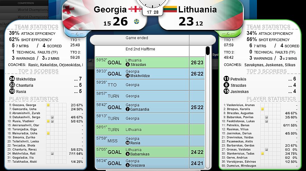 Lietuvos rinktinė trečiadienį Tbilisyje pralaimėjo pasaulio čempionato atrankos 5-ojo turo rungtynes Gruzijos rinktinei 23:26 (12:15). Mūsų šalies rankininkai tik mačo pradžioje buvo išsiveržę į priekį, o nuo 7-osios minutės visą laiką, dažniausiai 2-4 įvarčiais, pirmavo gruzinai.