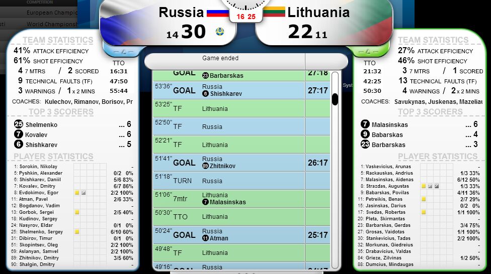 Rusija – Lietuva 30:22 (14:11). 1500 žr. S.Šelmenko 6, D.Kovaliovas 6, D.Šiškariovas 5/A.Malašinskas 6, P.Babarskas 4, G.Babarskas 3, T.Stankevičius 2, B.Petreikis 2, A.Račkauskas 1, A.Strazdas 1, R.Švedas 1, V.Grosas 1, Ž.Griežė 1.