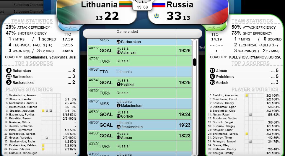 Rusai rungtyniavo įvairiau ir sumaniau, dažnai sugebėdavo išsklaidyti lietuvių gynybą ir perduoti kamuolį linijos žaidėjui. O antrajame kėlinyje svečiams pradėjus grėsmingai tolti (17:22 – 41-ąją minutę), Lietuvos rankininkai nuleido rankas ir tik keliose trumpose atkarpose sukėlė varžovams nedidelių problemų. Tačiau minčių, kad vaizdas aikštėjė gali drastiškai pasikeisti, nebuvo.