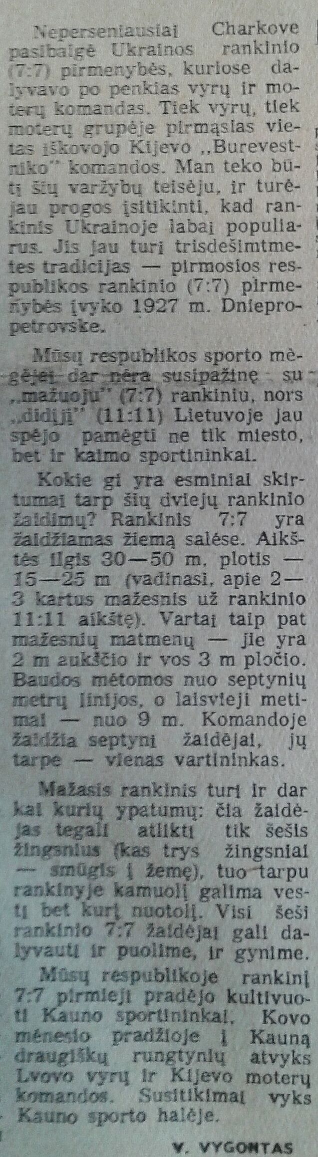 „Nepaparastai didele sparta prasidėjo Lvovo ir Kauno vyrų komandų dvikova. Kauniečiai, jau žinodami silpnąsias svečių žaidimo puses (jie retai praktikuoja daugkartinį kamuolio vedimą ir užtvarų statymą), panaudojo mažajame rankinyje neįprastą asmeninę gynybą. Kauniečių taktika visiškai pasiteisino.