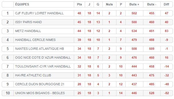 Pirmauja: 32 – „Montpellier“ (18), 31 – PSG, 24 – „St.Raphael“, „Dunkerque“, 23 – „Chambery“, 20 – „Nantes“ (18), 17 – „Cesson“, „Creteil“.