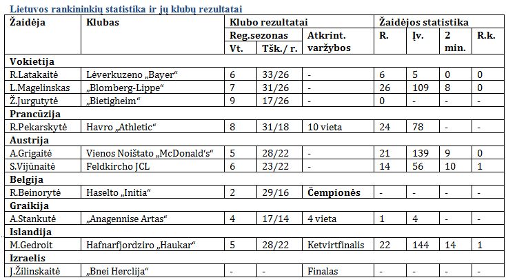 Tarp užsienio klubuose žaidusių Lietuvos rankininkių skambiausia gaida sezoną baigė Renata Beinorytė. Haselto „Initia“ klubo vartininkė tapo Belgijos čempione. Haselto komanda šiais metais laimėjo ir Belgijos taurę, o be R.Beinorytės svetur titulą iškovojo tik Jūratė Žilinskaitė, padėjusi „Bnei Herclija“ klubui laimėti Izraelio taurę.