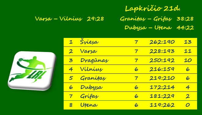 | Įmesti įvarčiai | 9 – Grigas, Granitas (su Grifu), Drevinskas, Vilnius (su Varsa) | 14 – Vilkoicis, Grifas (su Dubysa, 1) |