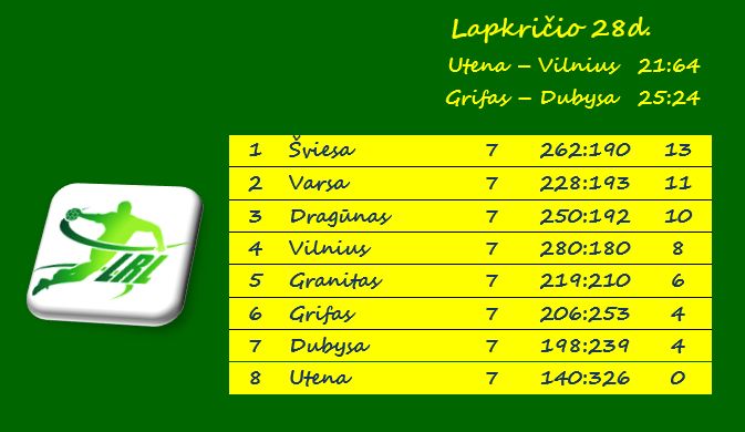 Dvejos šeštadienį vykusios Lietuvos vyrų rankinio lygos rungtynės buvo skirtingos kaip diena ir naktis. Jei Panevėžyje rankininkai dėl pergalės kovojo iki paskutiniųjų akimirkų ir namie žaidęs „Grifas“ pranoko Šiaulių „Dubysą“ tik 25:24, tai Utenoje tikrą įvarčių liūtį surengė „Vilniaus“ rankininkai, sutriuškinę šeimininkus rekordiniu 43 įvarčių skirtumu 64:21.
