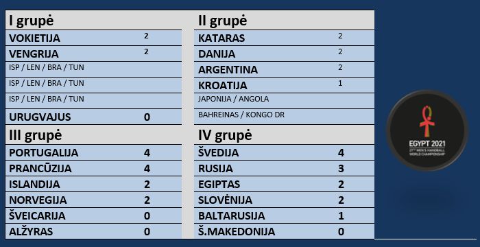 Egipte vykstančiose pasaulio vyrų rankinio pirmenybėse keturių grupių komandos pirmadienį sužaidė paskutines pirmojo etapo rungtynes. Nepraradę nė taško tarpinį finišą pasiekė Portugalijos, Prancūzijos ir Švedijos rankininkai.