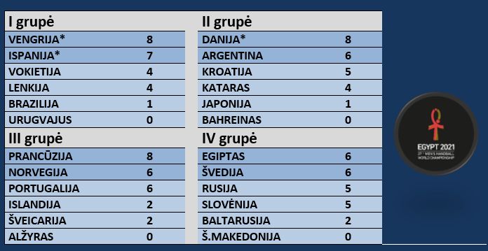 Ispanijos, Vengrijos ir Danijos rinktinės šeštadienį pratęsė nepralaimėtų rungtynių virtines ir užsitikrino kelialapius į Egipte vykstančių pasaulio vyrų rankinio pirmenybių ketvirtfinalį. Prisidėti prie šios trijulės tikėjosi ir Kroatijos rankininkai, tačiau jie sensacingai pralaimėjo Argentinos rinktinei.