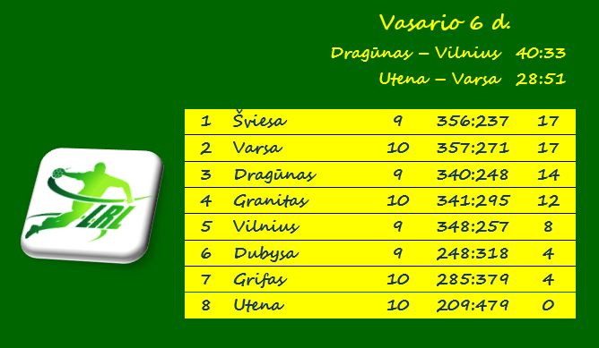 Lietuvos rankinio lygos lyderę Vilniaus „Šviesą“ besivejančios komandos šeštadienį iškovojo po du taškus. Tiesa, Alytaus „Varsai“ dėl jų išlieti daug prakaito nereikėjo – dzūkai išvykoje sutriuškino autsaiderę „Uteną“ 51:28. Tuo tarpu stipriausias praėjusio dešimtmečio Lietuvos klubas Klaipėdos „Dragūnas“ turėjo gerokai pasistengti, kad nugalėtų „Vilnių“ 40:33.
