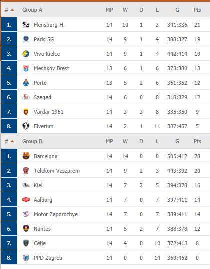 Jei B grupėje visas rungtynes laimėjusi „Barcelona“ pirmąją vietą užsitikrino dar prieš kelias savaites, tai A grupės nugalėtojai paaiškėjo tik paskutinėse rungtynėse akis į akį susitikus dviem lyderiams. Ketvirtadienį lemiamoje dvikovoje „Flensburg-Handewitt“ išvykoje nugalėjo „Kielce“ rankininkus 31:28 ir pakilo į viršutinę lentelės eilutę.