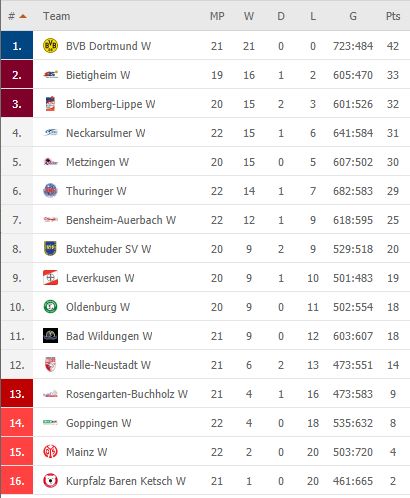 Pirmauja: 42/21 – „Borussia“, 33/19 – „Bietigheim“, 32/20 – „Blomberg“, 31/22 – „Neckarsulm“, … 19/20 – „Bayer“.
