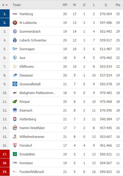 Pirmauja: 35/20 – „Hamburg“, 29/19 – „N-Lubbecke“, „Gummersbach“, 25/20 – „Lubeck“, 23/19 – „Bayer“, 22/18 – „Aue“, 22/20 – „Elbflorenz“.