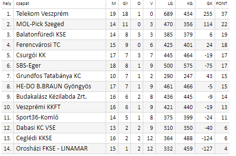 Pirmauja: 37/19 – „Veszprém“, 22/14 – „Szeged“, 19/14 – „Balatonfüred“, 18/15 – „Ferencvaros“, 17/17 – „Csurgo“, 17/18 – „Eger“, 15/10 – „Grundfos“.
