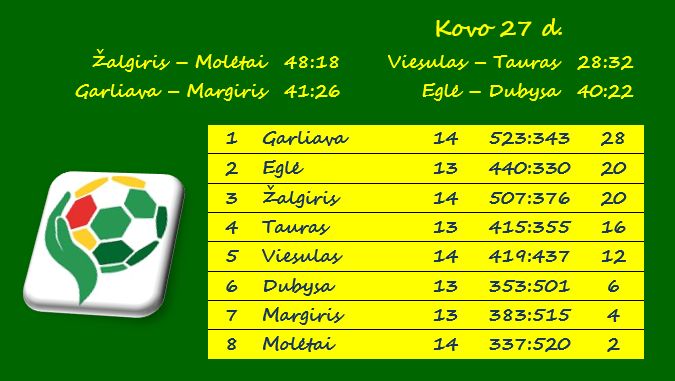 Formaliai „Dubysa“ ir „Margiris“ dar gali pasikeisti vietomis, o kitų komandų galutinės pozicijas jau aiškios. Pirmąją vietą užims „Garliava“, antrąją – „Eglė“, trečiąją – „Žalgiris“, ketvirtąją – „Tauras“, penktąją – „Viesulas“, aštuntąją – „Molėtai“.