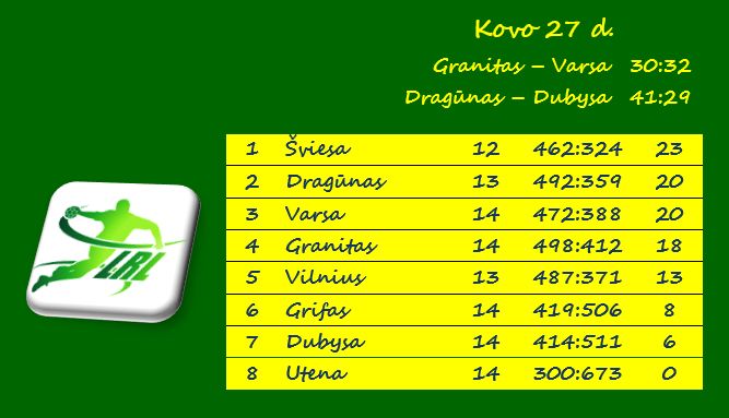 „Dragūnas“ šeštadienį namie įveikė Šiaulių „Dubysą“ 41:29, o dėl trečiosios vietos kovojusių komandų dvikovoje „Varsa“ išvykoje nelauktai įtikinamai nugalėjo Kauno „Granitą“ 32:30 (šis rezultatas taip pat įtrauktas į Baltijos lygos lentelę). „Granitas“ ir „Varsa“ dar galėjo pakilti į antrąją vietą, bet tik tuo atveju, jei šeštadienį taškus būtų praradę klaipėdiečiai.