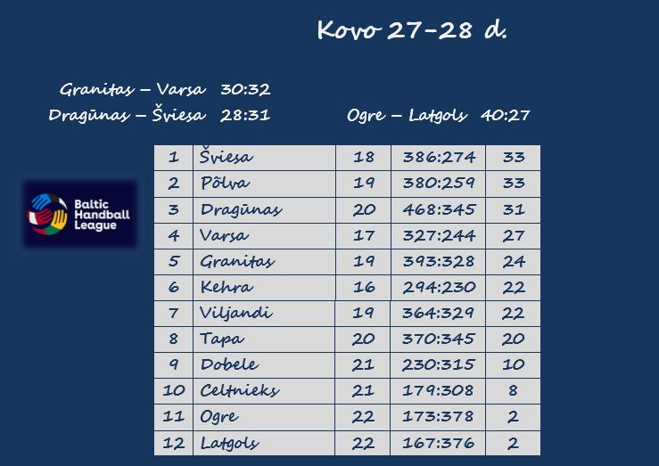 Lietuvių dvikovose Alytaus „Varsa“ svečiuose įveikė Kauno „Granitą“ 32:30, o Vilniaus „Šviesa“ irgi išvykoje nugalėjo Klaipėdos „Dragūną“ 31:28. Latvių akistatoje „Ogre“ savo aikštėje sutriuškino Ludzos „Latgols“ 40:27. Uogrės rankininkai iškovojo pirmuosius taškus.