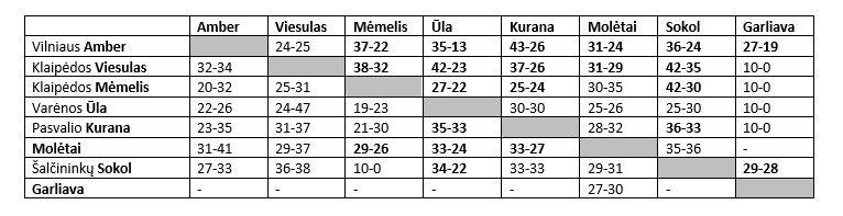 | 5 | Šalčininkų „Sokol“ | 13 | 386:401 | 11 |