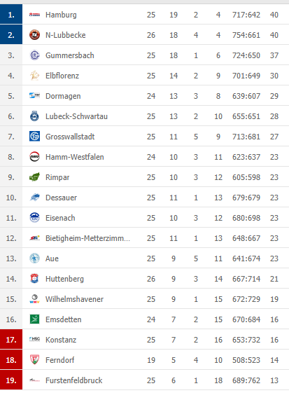 Pirmauja: 40/22 – „Flensburg“, 39/22 – „Kiel“, 38/26 – „Rhein-Neckar“, 36/24 – „Magdeburg“, 33/23 – „Frisch Auf“, … 15/25 – „Balingen“.