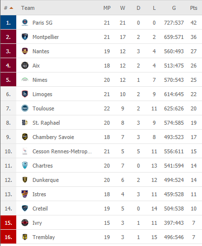 Pirmauja: 42/21 – PSG, 36/21 – „Montpellier“, 27/19 – „Nantes“, 26/18 – „Aix“, 25/20 – „Nimes“, … 17/18 – „Chambery“.
