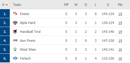 Pirmauja: 21 – „Füchse“, 20 – „Hollabrunn“, 16 – „Voslau“, 13 – „Leoben“, 12 – „Atzgersdorf“, 11 – „Union“.