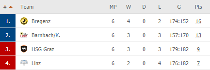 Lentelė: 16 – „Bregenz“, 13 – „Barnbach“, 9 – „Graz“, 7 – „Linz“.