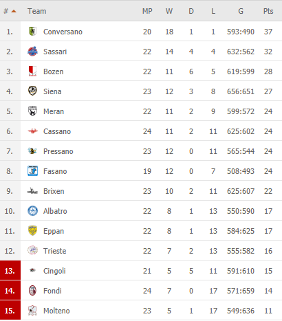 Pirmauja: 37/20 – „Conversano“, 32/22 – „Sassari“, 28/22 – „Bolzano“, … 17/22 – „Eppan“.