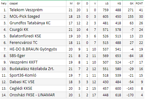Pirmauja: 41/21 – „Veszprém“, 30/18 – „Szeged“, 26/17 – „Grundfos“, 24/21 – „Csurgo“, … 18/21 – „Eger“.