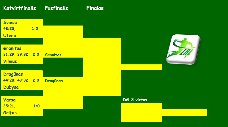 Į pusfinalį jau praėjusį savaitgalį pateko Klaipėdos „Dragūnas“. Alytaus „Varsa“ ir Panevėžio „Grifas“ antrąsias ketvirtfinalio rungtynes turėtų žaisti šeštadienį, Vilniaus „Šviesa“ ir „Utena“ – gegužės 1 dieną. Po pirmųjų rungtynių serijose pirmauja „Varsa“ ir „Šviesa“.