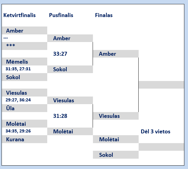 Vilniaus „Amber“ – Šalčininkų „Sokol“ 33:27 (18:9). Tumosas 10, Aukštikalnis 4/ Gaidukas 8, Šibeko 5, Girdijevskis 5.