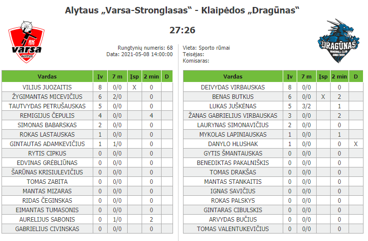 Alytaus „Varsa“ – Klaipėdos „Dragūnas“ 27:26 (12:14). Serija 2:0.