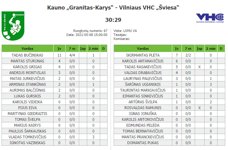 Kauno „Granitas“ – Vilniaus „Šviesa“ 30:29 (15:10). Serija 1:1.