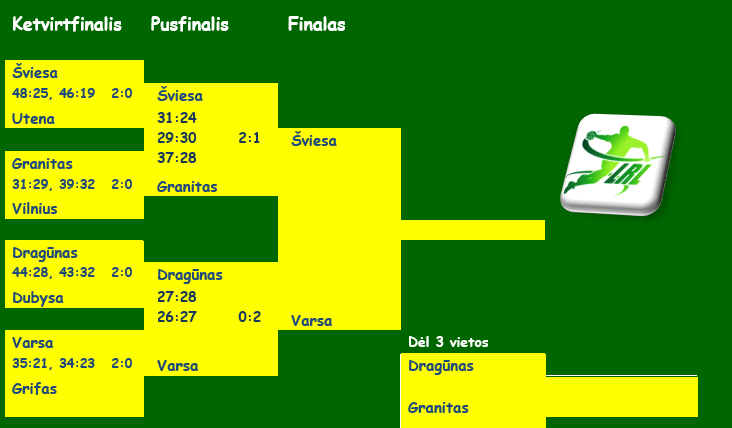 Svarbiausioje sezono dvikovoje bus kovojama iki trijų pergalių. Rungtynės numatomos gegužės 15, 19, 22 ir, jei reikės, 26 bei 29 dienomis. Šeštadienį taip pat prasidės mačas dėl trečiosios vietos, kuriame iki dviejų pergalių žais „Dragūnas“ ir „Granitas“.