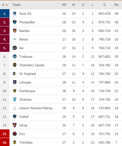 Pirmauja: 49/26 – PSG, 48/28 – „Montpellier“, 43/28 – „Nantes“, 35/27 – „Nimes“, 34/27 – „Aix“, 30/28 – „Toulouse“, 29/28 – „Chambery“.