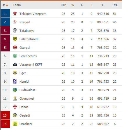 Pirmauja: 51/26 – „Veszprém“, 46/26 – „Szeged“, 36/26 – „Grundfos“, … 23/26 – „Eger“.