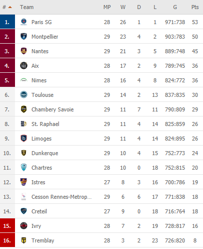 Pirmauja: 53/28 – PSG, 50/29 – „Montpellier“, 45/29 – „Nantes“, 36/28 – „Aix“, „Nimes“, 30/29 – „Toulouse“, 29/29 – „Chambery“.