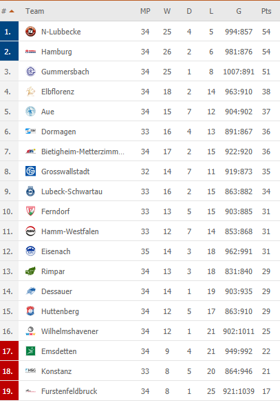 Pirmauja (po 34 rungt.): 54 – „N-Lubbecke“, „Hamburg“, 51 – „Gummersbach“, 38 – „Elbflorenz“, 37 – „Aue“.
