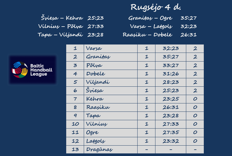 Baltijos vyrų rankinio lygos pirmajame ture pergales iškovojo trys iš keturių Lietuvos komandų. Šeštadienį laimėti nepavyko tik Baltijos lygos debiutantui „Vilniui“. Jis pripažino Estijos čempiono Pylvos „Serviti“ pranašumą 27:33 (13:15).