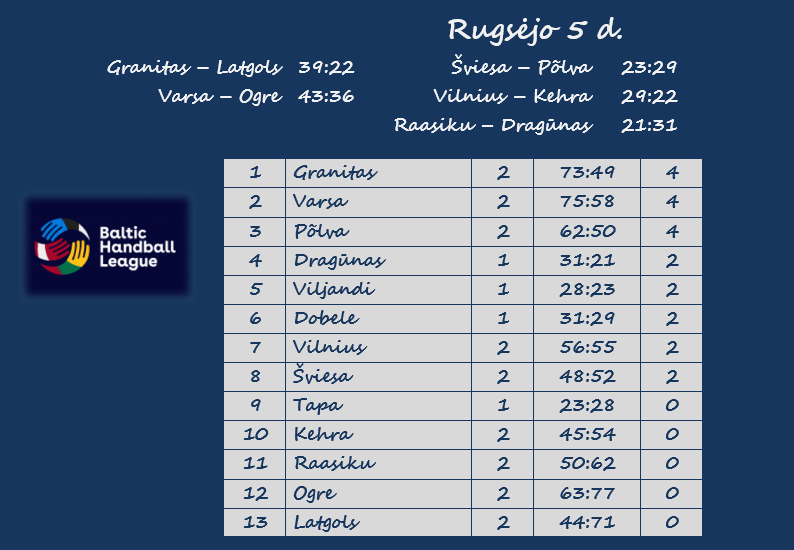 Kitos Baltijos lygos rungtynės vyks rugsėjo 22 d., kai Vilniuje susitiks dvi Lietuvos sostinės komandos. Visas turas bus žaidžiamas rugsėjo 25-26 d. Tą savaitgalį į Klaipėdą atvyks „Viljandi“ ir „Tapa“, o „Granitas“ ir „Varsa“ keliaus į Estiją ir kovos su šios šalies rankinio lyderiais „Serviti“ ir „Horizon“.