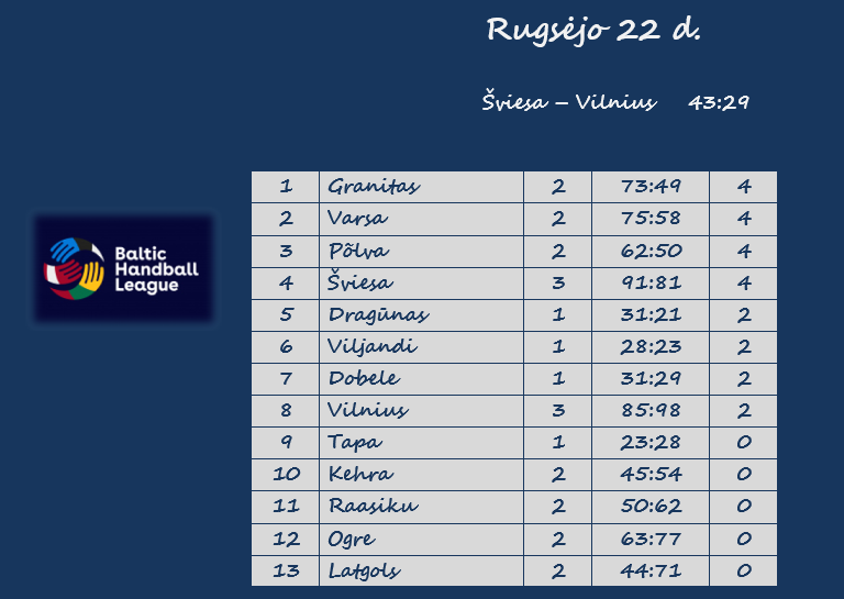 Kitos Baltijos lygos rungtynės vyks savaitgalį. Kauno „Granitas“ ir Alytaus „Varsa“ keliaus į Estiją, kur rugsėjo 25-26 dienomis susitiks su Pylvos „Serviti“ ir Kehros „Horizon“, o Klaipėdos „Dragūnas“ priims Estijos komandas „Viljandi“ ir „Tapa“. Abi Vilniaus ekipos savaitgalį nežais.