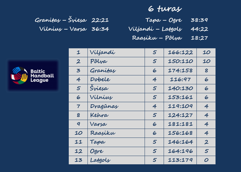 Baltijos lygoje taškų kol kas neprarado tik dvi Estijos komandos. „Viljandi“ ir Pylvos „Serviti“ iškovojo po penkias pergales ir surinko po 10 taškų. Trečiąją vietą užima „Granitas“, kuris per šešerias rungtynes iškovojo 8 taškus.