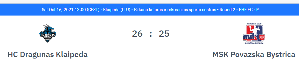 Klaipėdos „Dragūnas“ – „Považska Bystrica“ 26:25 (8:15). Palskys 7, Lapiniauskas 4, Butkus 4, Hlušakas 3, Seyedas 3, Bučius 2, Drakšas 2, Simonavičius 1 / Briatka 8, Jurakas 5.