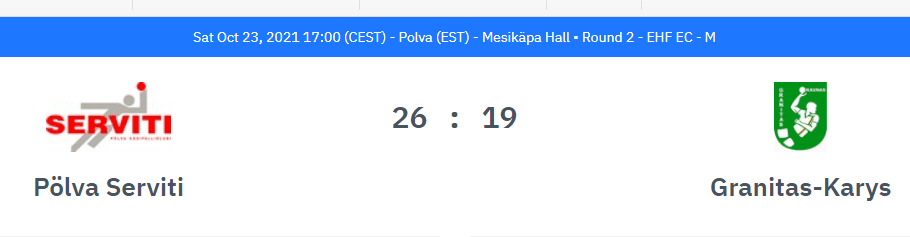 Pylvos „Serviti“ – Kauno „Granitas“ 26:19 (14:12). Kase 8, Rudisaaras 6/ Eiva 5, Jurkevičius 4, Lazauskas 4, Kairys 3, Montvilas 1, Feoktistovas 1, Gurskis 1.