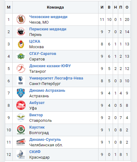 Pirmauja: 20 – Čechovo „Medvedi“, 14 – Permės „Medvedi“, 13 – CSKA, SGAU, 12 – „Kazaki“, 10 – „Neva“.
