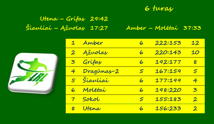Trys Lietuvos rankinio lygos lyderiai šeštadienį šeštajame ture papildė pergalių sąskaitas. Antrąją ir trečiąją vietas užimantys Kauno „Ąžuolas“ ir Panevėžio „Grifas“ dviženkliu skirtumu nugalėjo išvykose, o turnyre pirmaujantis Vilniaus „Amber“ sulaukė atkaklesnio varžovų pasipriešinimo, bet savo salėje įveikė „Molėtų“ rankininkus.