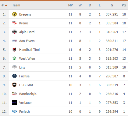 Pirmauja (po 11 rungt.): „Bregenz“ ir „Krems“ – po 18, „Alpla“ ir „Fivers“ – po 17, „Tirol“ – 14.
