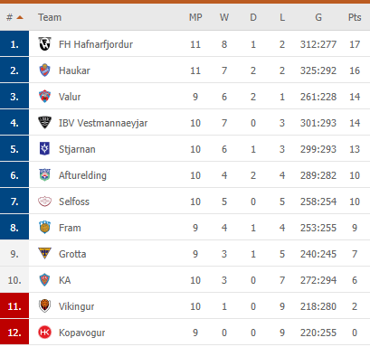 Pirmauja: FH – 17, „Haukar“ – 16, „Valur“ ir IBV – po 14.