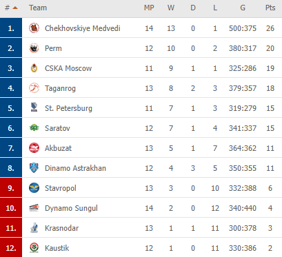 Pirmauja: Čechovo „Medvedi“ – 26, Permės „Medvedi“ – 20, CSKA – 19, „Kazaki“ – 18, „Neva“, SGAU – po 15, „Akbuzat“ – 11.
