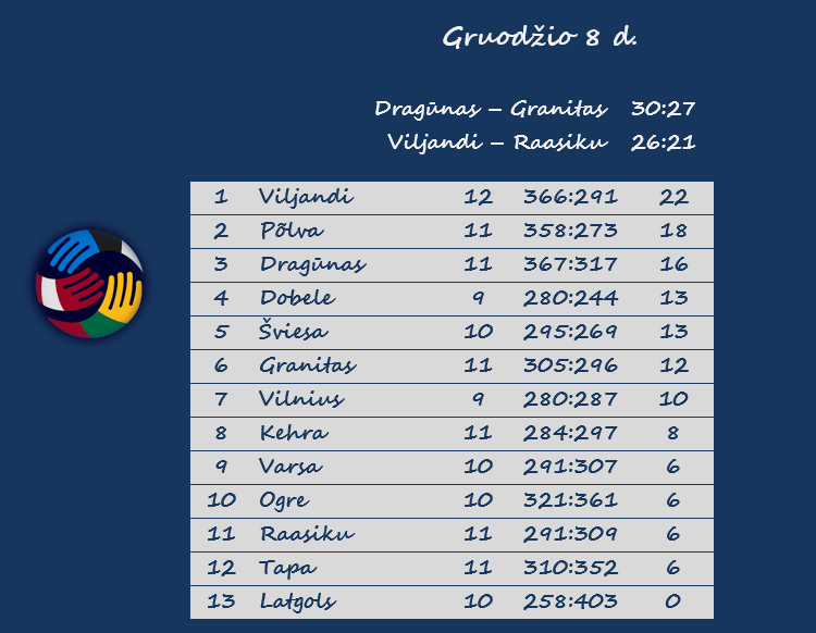 „Viljandi“ – Rasiku „Mistra“ 26:21 (14:10). Voika 7, Loppas 4, Basarabas 4 / Naumenko 7.