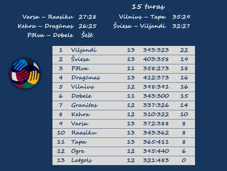 „Šviesa“ namie įveikė lygos lyderį „Viljandi“ 32:27, „Vilnius“ – „Tapa“ 35:29. „Vilniaus“ komanda šį savaitgalį atvežė Baltijos lygą į Molėtus, kuriuose priims ne tik Tapos, bet ir Viljandžio rankininkus.