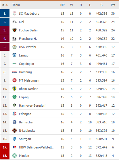 Pirmauja: „Magdeburg“ – 30, „Kiel“ ir „Füchse“ – po 24, „Flensburg“ – 22, … „N-Lübbecke“ – 10.