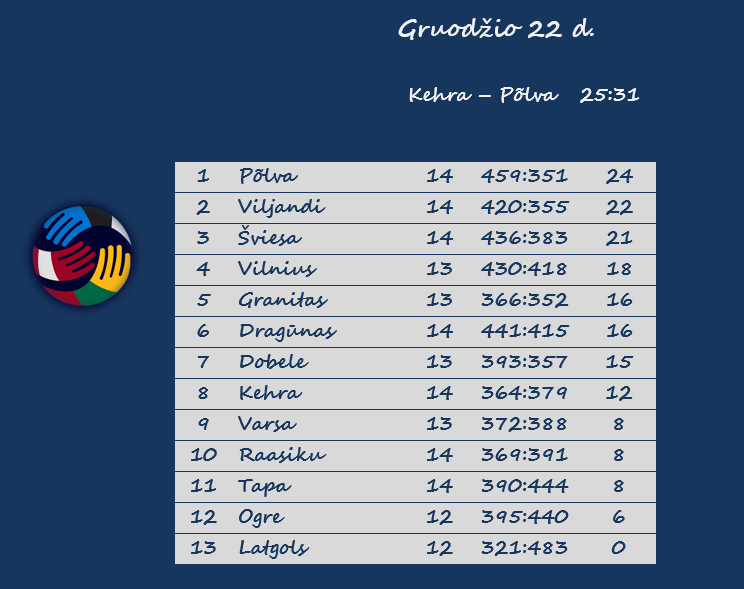 Estijos čempionė Pylvos „Serviti“ komanda bent mėnesį bus vienvaldė Baltijos vyrų rankinio lygos lyderė. Pylvos rankininkai trečiadienį paskutinėse metų rungtynėse išvykoje nugalėjo Kehros „Horizon“ komandą 31:25 ir įsitvirtino pirmojoje vietoje.