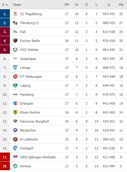 Nors ir suklupo, „Magdeburg“ vis dar užtikrintai pirmauja bundeslygoje. Lyderiai per 17 rungtynių surinko 32 taškus ir 5 taškais lenkia į antrąją vietą pakilusią „Flensburg“ komandą. 6 taškais atsilieka čempiono vardą ginantis „Kiel“, 7 taškais – Berlyno „Füchse“.